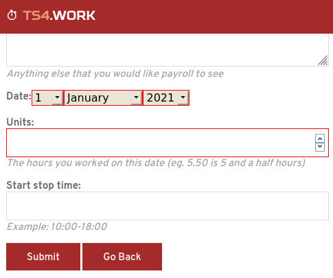 Click on 'New Timesheets' on the timesheets list page. Then you will need to enter (at least) the information in the required fields for you timesheet to be processed.